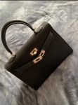 Very classy Bag. Can serve as a top handle and cross body bag. Contains a handle wrap scarf which is silk! and an adjustable leather strap. It is true to its size just as seen in the picture